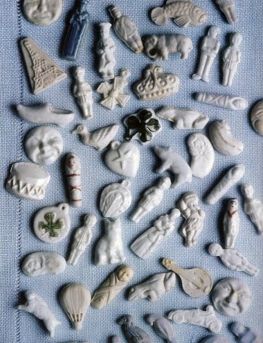 During the festival of Epiphany, people in Northern France and Belgium eat the galette des Rois, (flaky puff pastry with almond cream or frangipane.) In the South of France it is called gâteau des Rois or Royaume, and is made of brioche.This is a kind of "kings' cake" with a trinket (feve) -- a porcelain figurine or a bean hidden inside. The person who gets the piece of cake with the trinket becomes "King" or "Queen" for a day. There is a whole collectors market for feves in France.