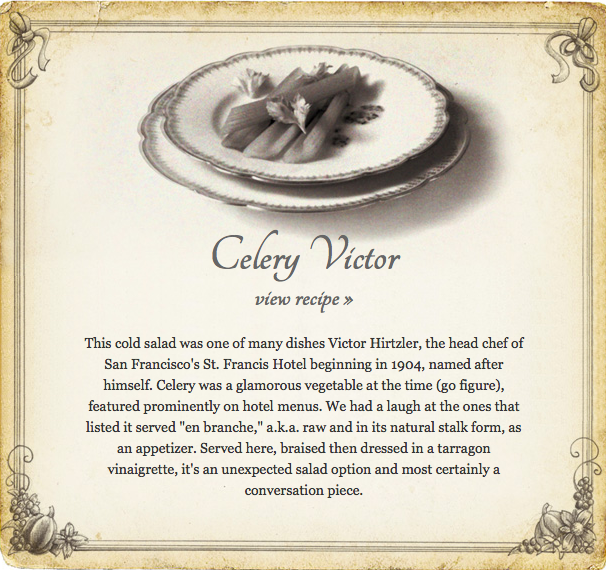 Thanks to Chow, they've dug up dozens of old hotel menus from library archives, went to work in their test kitchen, and voila! We have a lovely menu of a holiday feast fit for a King or Queen.